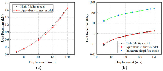With the stiffness contribution mechanism of PV modules to cable-suspended PV system clarified, an equivalent stiffness model (ESM) is developed. Using the high-fidelity model (HFM) of the glass–glass PV module as the reference, the ESM is calibrated to match the mass and torsional stiffness of the HFM. Through computation, the geometric and material properties of the ESM are determined as follows: the geometry is identical to that of the actual module (2278 mm × 1134 mm × 35 mm); the material density is 360.6 kg/m3, corresponding to a module weight of 32.6 kg; the elastic modulus is 0.525 GPa; and the Poisson’s ratio is 0.3. Figure 11a presents the displacement–reaction force curves under torsion for both the HFM and the ESM, showing good agreement. This indicates that the torsional stiffness of the ESM is equivalent to that of the HFM. Additionally, Figure 11b compares the torsional displacement–reaction curves for three models. To facilitate comparison, logarithmic axes are used in the plot due to the substantial stiffness difference among the models. It can be clearly seen that the inaccurate simplified model (ISM) exhibits a much higher stiffness than the other two, confirming that this modeling approach significantly overestimates the stiffness of PV modules.