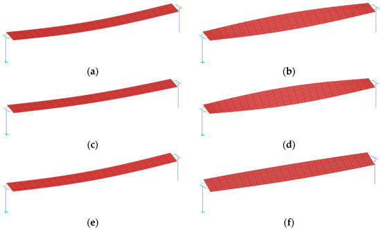 Mode shapes and frequencies of different models: (a) HFM—First vertical bending mode (1.167 Hz); (b) HFM—First torsional mode (1.071 Hz); (c) ESM—First vertical bending mode (1.159 Hz); (d) ESM—First torsional mode (1.056 Hz); (e) ISM—First vertical bending mode (1.170 Hz); (f) ISM—First torsional mode (2.268 Hz).