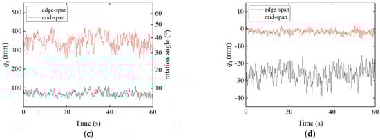Mid-span and edge-span PV modules and their modal coordinate time histories (28.3 m/s, suction): (a) Vertical translation; (b) Longitudinal rotation; (c) Transverse rotation; (d) Torsion.