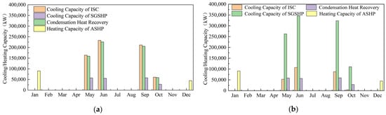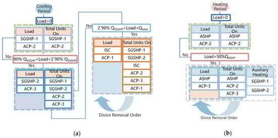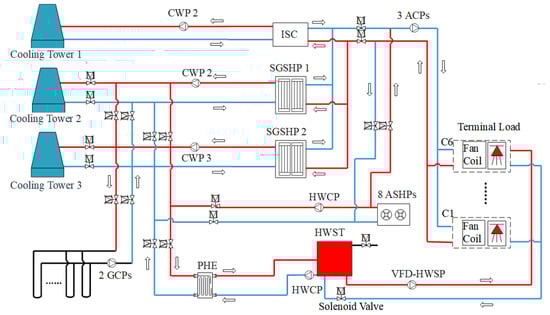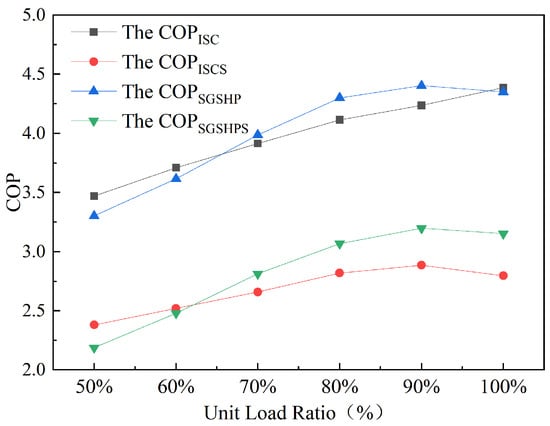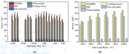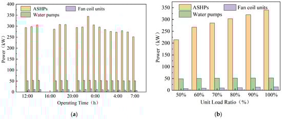 - For the practical regional multi-energy system, the power consumption of the units and pumps increased as the unit load increased for air-conditioning cooling. However, the proportion of power consumed by the units increased by 4.15%, while the proportion of the water pump’s power decreased by 4.24%. At a unit load ratio of 90%, COPSGSHP and COPSGSHPS reached maximum values of 4.4 and 3.2, respectively. During system heating, the power consumption of the ASHPs continuously increased for the unit load ratio range of 50–100%, and their share of the total power consumption increased. The proportion of all the water pumps and FCUs of the total power consumption also significantly decreased. A reasonable unit load ratio enhances the unit’s operating efficiency, and 90% was recommended under the conditions in this paper.