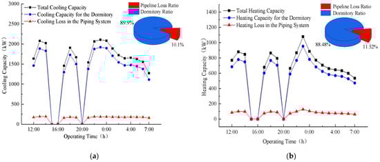- For the practical regional multi-energy system, the daily use of the cooling capacity was approximately 89.76% of the total cooling capacity, with pipeline losses of around 10.24%. The power consumption of the water pumps was significantly higher than that of the regional multi-energy system for heat dissipation and terminal air-conditioning equipment. The daily use of the heating capacity was approximately 88.5% of the total heating capacity, with pipeline losses of around 11.5%.