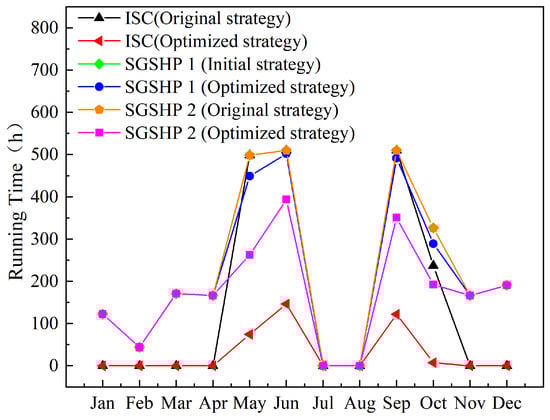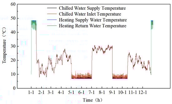 - A TRNSYS building simulation model was established based on the optimisation operation control strategy. After optimisation, the total running time of all units decreased by 28.83%, with the chiller unit’s operating time decreasing the most, approximately 80.04%. The total power consumption of the optimised system decreased by about 19%, and the power consumption of all units throughout the year increased by 6.68% compared to the original operation strategy, which indicated that the unit’s operating efficiency was improved. The cooling/heating capacity of the optimised system changed little, and the system still met the terminal load requirements. Furthermore, the condensate heat recovery during the cooling season increased by about 2.3%.