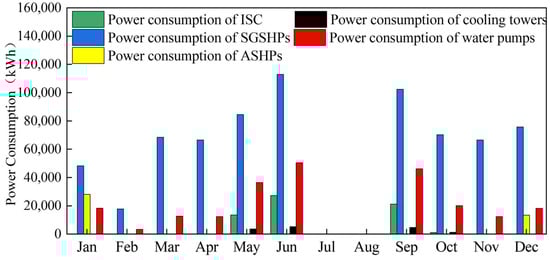 | Month | ISC (kWh) | SGSHPs (kWh) | ASHPs (kWh) | Cooling Towers (kWh) | All the Water Pumps (kWh) | Total System Power (kWh) |