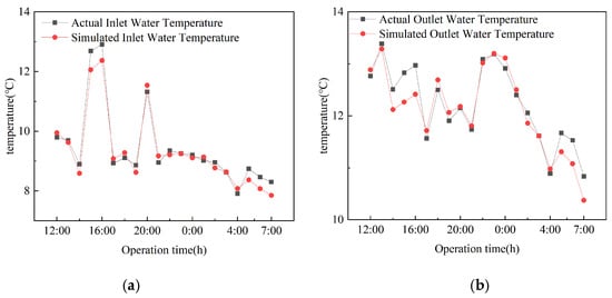 Figure 10 shows the annual temperature variation in cooling and heating water in the air conditioner of the regional multi-energy system. The simulation system uses experimental data as the baseline and adjusts system parameters based on the cooling and heating load obtained from the DesignBuilder model to ensure that the simulated data align with actual conditions. Figure 11 shows the comparison of measured and simulated inlet and outlet water temperatures for randomly selected days during the cooling and heating seasons, respectively.