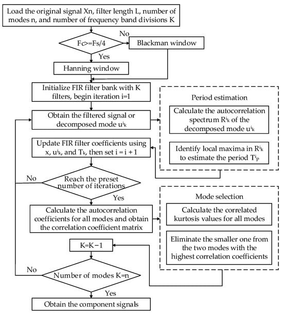 where is the covariance between signals and , and and are the standard deviations of signals and , respectively. This results in a matrix of size , representing the pairwise signal correlations. The correlation kurtosis of the two signals with the highest correlation coefficient is compared, and the signal with the higher correlation kurtosis is retained. By updating the signals and filters, redundant signals are removed, and the final modes are obtained. The improved FMD algorithm proposed in Ref. [30] follows the procedure illustrated in Figure 1.