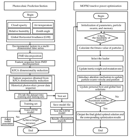 In the previous section, the PV forecasting model provided critical decision-making support for reactive power optimization by accurately predicting short-term photovoltaic generation. To further enhance the PV hosting capacity, this study develops a reactive power optimization model for distribution networks based on an improved multi-objective particle swarm optimization (MOPSO) algorithm. In this model, a multi-head attention mechanism is introduced into the particle velocity update process to enhance the algorithm’s global guidance and local exploration capabilities during the solution space search. The overall workflow is shown in Figure 2.