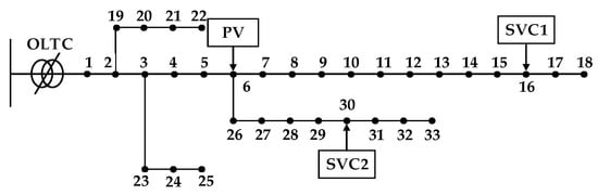 To verify the feasibility and effectiveness of the proposed model, a simulation study was conducted on the MATLAB 2018b platform using the modified IEEE 33-bus distribution system as the test system. The system operates at a voltage level of 12.66 kV, with a three-phase power base of 10 MVA. To reflect the characteristics of high-penetration PV integration, the total installed PV capacity was set to approximately 30% of the maximum active load in the distribution network—this ratio is commonly used as a threshold to define high-PV-penetration scenarios. However, excessive PV capacity, especially when connected near the end of feeder branches, can easily lead to voltage limit violations and associated control challenges. Considering the network topology and load distribution, a 1.2 MW PV plant was integrated at Bus 6. An OLTC was installed at Bus 1, with a voltage regulation range of [1.0, 1.1] p.u., a step size of 0.0125 p.u., and a total of 9 tap positions (0 to +8). Additionally, static var compensators with a capacity of 800 kvar were installed at Buses 16 and 30 to enhance reactive voltage support at the end of the feeder. The network topology is illustrated in Figure 3.