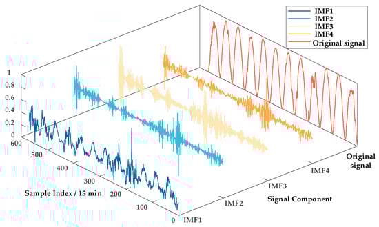 (1) FMD Decomposition Results: The photovoltaic data exhibit certain periodicity and random fluctuations. To highlight its signal characteristics, the FMD decomposition is applied to extract feature signals, resulting in 539 × 20 sets of feature data. The decomposition signals of global horizontal radiation are selected for visualization analysis, as shown in Figure 4.