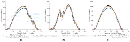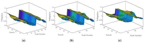 Overall voltage optimization results: (a) Scenario 1 involves no reactive power optimization under typical load access; (b) Scenario 2 considers only the optimized PV power curve without additional reactive power control; (c) Scenario 3 adopts the reactive power optimization method proposed in this study.