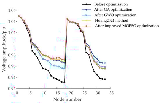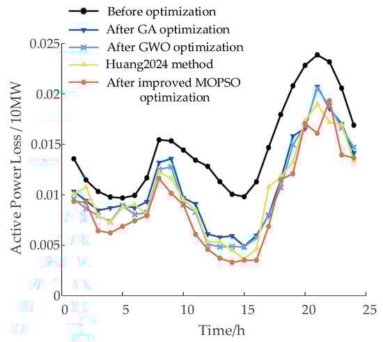 As shown in Figure 7, under the baseline scenario—where typical loads are connected but no optimization measures are applied—the voltage at certain nodes drops below the lower limit required for secure and stable operation. After applying the improved MOPSO algorithm, all node voltages are effectively maintained within the safe range of 0.95–1.05 p.u. In comparison with the GA, GWO, and the method proposed in Ref. [29], the improved MOPSO achieves the most notable voltage improvement near nodes 19 and 33, with an increase of approximately 3.8% relative to the unoptimized case. Figure 7 presents the voltage profile of node 33 over a 24 h period, further illustrating the superior voltage regulation capability of the proposed method. Figure 8 illustrates the variation in network losses under different algorithms over time, facilitating a temporal analysis of the optimization performance.