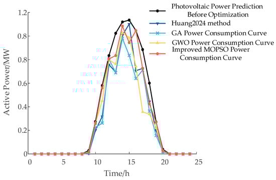As shown in the comparison results of PV utilization rates, the proposed improved MOPSO outperforms GA, GWO, and the method in Ref. [29]. By optimizing the reactive power compensation strategy, the proposed algorithm moderately curtails PV output around time step 15, where the injection is relatively high, while increasing PV utilization during other periods. This contributes to enhanced voltage stability and reactive power support capacity. Compared with Ref. [29], the proposed method improves the PV utilization rate by 13.15%, reduces the voltage deviation by 2.86%, and lowers the active power loss by 11.01%.