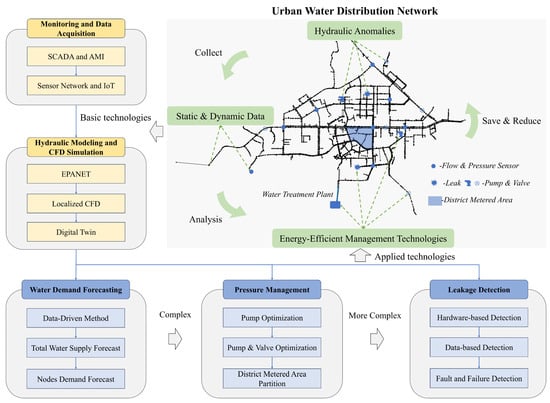 This review aims to provide an overview of current technologies for energy-efficient management of WDNs under hydraulic anomaly conditions, as illustrated in Figure 1. The basic technologies include (1) real-time monitoring and data acquisition, encompassing SCADA and AMI systems, smart sensor networks, and IoT integration, which provide dynamic data support for anomaly detection, and (2) hydraulic modeling and Computational Fluid Dynamics (CFD) simulation, covering the application of EPANET and recent advancements such as digital twin technology, which support network computation. These technologies establish the data and modeling infrastructure necessary for the development and implementation of advanced applications. Based on this foundation, the primary applied technologies include: (1) Demand forecasting techniques, highlighting the role of water demand prediction in energy-efficient operations, contrasting conventional and data-driven approaches, and exploring predictive control applications; (2) Pressure management strategies for energy optimization, including pump scheduling, pump-valve co-optimization, and district metered area (DMA) partitioning; and (3) Leakage anomaly detection technologies, addressing classification methods and early fault detection strategies.