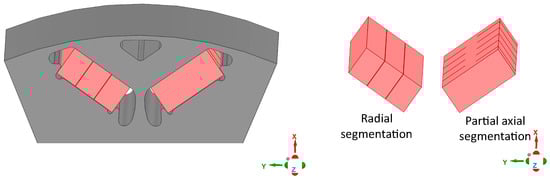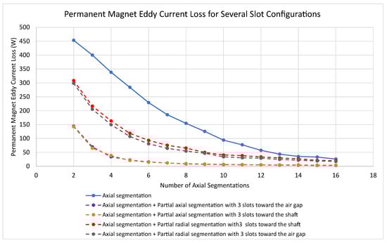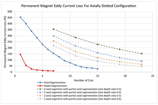 All partially segmented magnet configurations in the comparison consist of two axial segments with equal slot spacing. The results indicate that, for an equivalent number of cuts, axial and radial segmentation significantly outperform the designs with two axial segments and PS with respect to magnet loss. The radially segmented model (Figure 12b) is significantly more effective at reducing permanent-magnet loss than axial segmentation. The advantage of the partially segmented designs is that there are only two segments total, which would reduce the assembly and gluing steps in the manufacturing process.