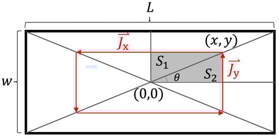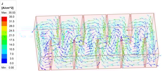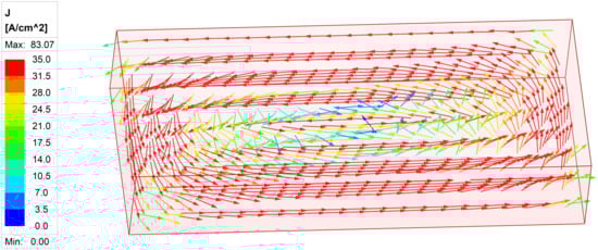 The framework for this analytical model is based on methods for estimating 2D to 3D correction factors [22]. In a typical magnet segment with no PS, the eddy current path can be mathematically approximated using the model in Figure 3 with parallel current paths to the sides of the magnet. The actual current path of the magnet as estimated through FE simulation is shown in Figure 4. L is the length of the magnet, w is the width of the magnet, and h is the height of the magnet. Based on this, the permanent magnet eddy current densities can be approximately derived from Faraday’s law in Equation (1).