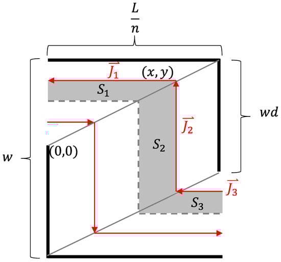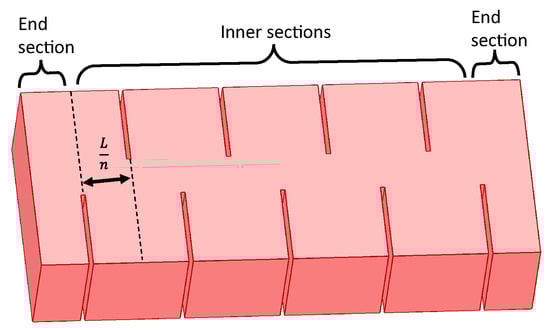 The geometric model parameters include the length of the magnet L, the width of the magnet w, the height of the magnet h, and the slot depth as a ratio of the magnet’s total width d. The variable n is the total number of inner and end sections for the magnet. A section is defined as the portion of the magnet between two slots or between a slot and the end of the magnet, as shown in Figure 7. Due to symmetry, the inner sections of the partially segmented magnet loss can be calculated based on a single section. In the analytical estimation, the change in the current path at the end sections is ignored as it has minimal impact on the overall estimates for higher slot counts. Additionally, accounting for the end sections requires numerical integration as a closed-form solution is difficult to derive. For the inner sections of the magnet, the geometric relationship between the current paths and the current densities is defined as follows: