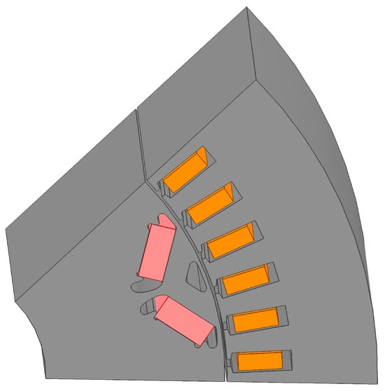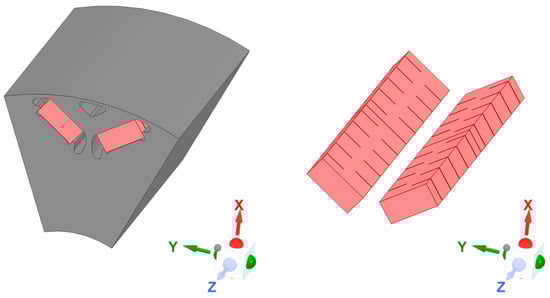 Based on these simulation results, the axial slot configuration was selected as it is more effective for magnets with longer stack length than width. To maximize the number of slots without compromising the magnet’s mechanical integrity for assembly, slots were applied to both sides of the magnet rather than only the side closer to the air gap, as shown in Figure 13.
