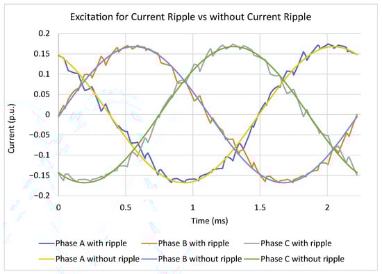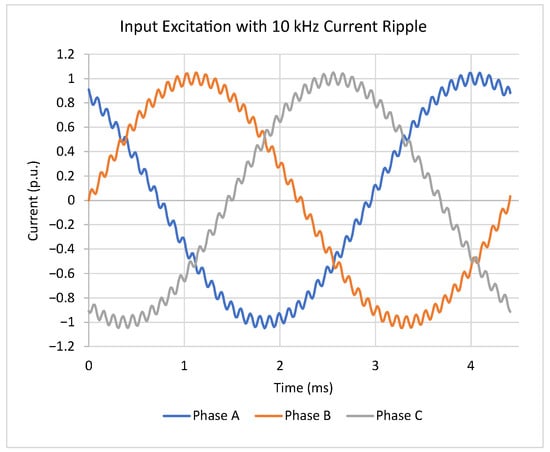 Various slot patterns were simulated to identify promising configurations for PS in IPM machines. The input excitations for these simulations were current waveforms with a 10 kHz sinusoidal harmonic component added to the fundamental component to represent switching harmonics, as shown in Figure 10. The simulations were conducted at a low-speed, high-torque operating point at the machine’s rated current. While actual switching harmonics span a broader frequency spectrum, this simplified excitation provides insight into how partially segmented magnets reduce switching losses in the permanent magnet. These simulations were conducted using transient 3D-FEA in Ansys Electronics Desktop (https://www.ansys.com/products/electronics, accessed on 20 May 2025).