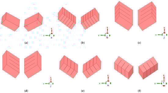 Segmented and partially segmented magnet configurations: (a) axially segmented magnet without PS; the symmetry of the model was used to create additional segments in the z-direction. (b) Radially segmented magnet without PS. (c) Partial axial segmentation with slots closer to the air gap. (d) Partial axial segmentation with slots further from the air gap. (e) Partial radial segmentation with slots closer to the air gap. (f) Partial radial segmentation with slots further from the air gap. (c–f) All include axial segmentation in the z-direction.