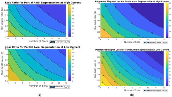 (a) PM loss ratio for partial axial segmentation at high current (above) and low current (below) as slot depth ratio and number of slots were swept. (b) PM loss for partial axial segmentation at high current (above) and low current (below) as slot depth ratio and number of slots were swept.