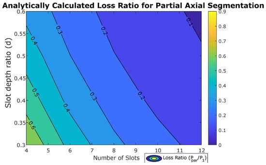 Additionally, the loss reduction ratio was analytically estimated using Equation (18) and plotted in Figure 16. The analytical model tends to overestimate loss reduction, particularly for configurations with a high slot count and shallow slot depth compared to the simulation results in Figure 15a.