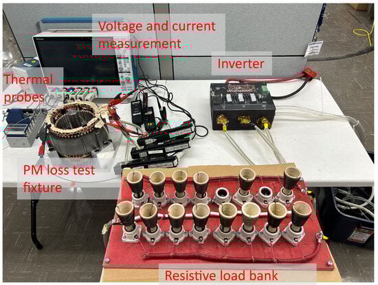 The total loss of the test fixture includes the AC and DC winding losses, the rotor and stator core losses, and the permanent-magnet loss (for tests with magnets in the rotor). The measurement is taken directly from the test fixture windings; therefore, the losses from the resistive load bank and inverter are not included in the measurement.