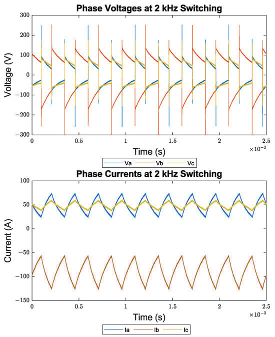 Figure 22 presents the three phase voltage and current measurements for the test fixture at a 2 kHz switching frequency. The operating point selected corresponds to a 0.6 modulation index with a 60° phase angle. The sampling rates used were 125 MS/s, 250 MS/s, and 625 MS/s for switching frequencies of 2 kHz, 5 kHz, and 8 kHz, respectively.
