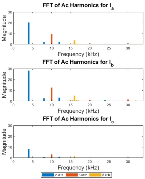 The FFT of the AC harmonic components for 2 kHz, 5 kHz, and 8 kHz switching frequencies at 0.6 modulation index and 60° phase angle.
