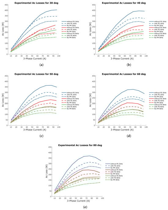 Estimated permanent-magnet losses of experimental test fixture with and without PS at all switching frequencies. (a–e) Each graph depicts the losses for a different phase angle.