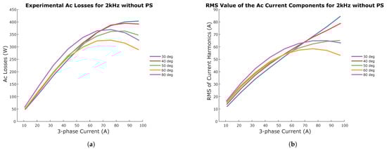 For magnets without PS, Figure 25a shows the phase shift’s effect on AC losses for a 2 kHz switching frequency, while Figure 25b shows its impact on the RMS value of the AC harmonic components. As expected, phase angles with higher AC losses corresponded to greater harmonic content. The AC losses tend to decrease from 30° to 60° before increasing again at 80°. This trend remained consistent across the other switching frequencies of 5 kHz and 8 kHz.