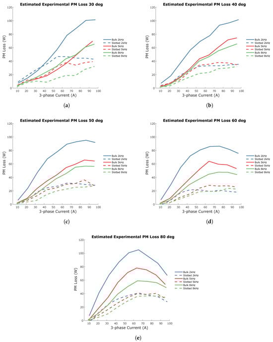 Figure 24a–e present the AC losses measured in the test fixture for test cases without PS, with PS, and with no magnets under 2 kHz, 5 kHz, and 8 kHz excitation at various phase angles. Across all phase angles and frequencies, test cases without PS exhibited the highest AC losses at high currents, whereas the partially segmented magnets showed reduced AC losses, and the no-magnet configuration had the lowest AC losses as it eliminated permanent-magnet losses.
