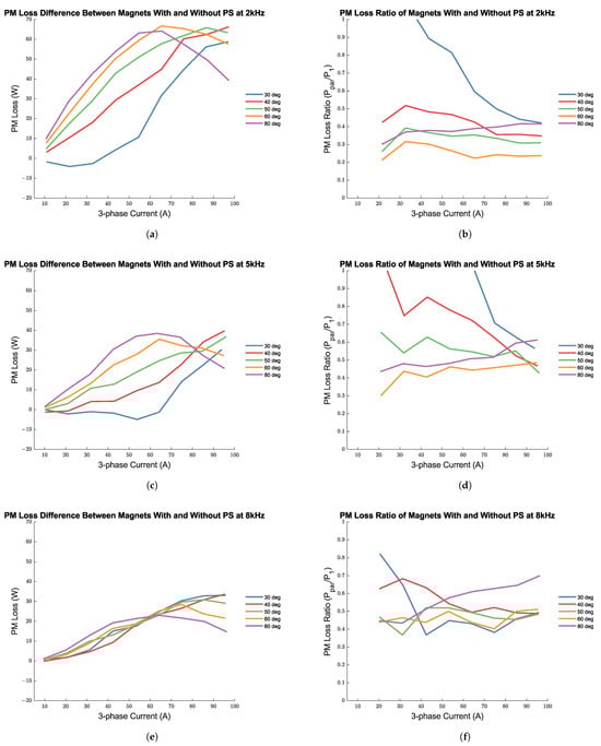 (a,c,e) Estimated permanent-magnet loss difference with and without PS. (b,d,f) Loss ratio comparing magnets with and without PS.