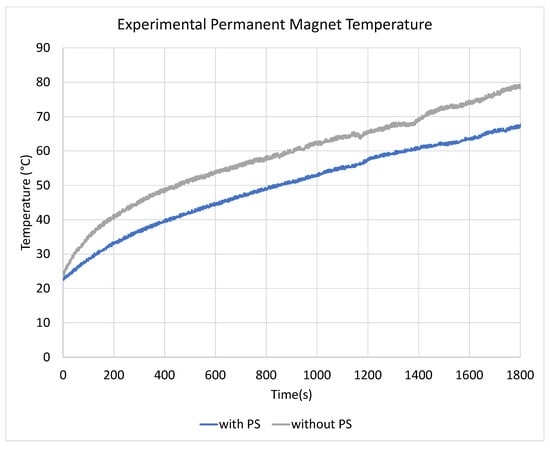 The voltage and current measurements of the test fixture show a reduction in losses from the partially segmented magnets; however, this does not address the effect of PS on the magnet temperature. To investigate this, a thermocouple was attached to the front face of the magnet to measure its temperature as switching losses were applied. The operating point selected for this experiment was the current excitation with the largest percent loss differential, which was at 2 kHz switching, 60° phase shift, and approximately 65 . The experiment ran for approximately 30 min, starting from room temperature. No cooling system was used for the test fixture. The magnet temperatures with and without PS are plotted in Figure 28.