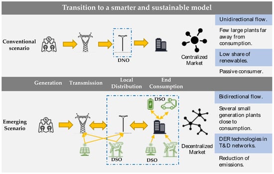 According to a document published by OATI (Open Access Technology International, Inc.: Bloomington, MN, USA), the DSO is defined as the entity responsible for the reliable operation of the distribution system (traditional role) while providing demand-side services []. To achieve the energy transition in the coming years, the distribution grid will have to accommodate an increasing amount of DER, allowing the operation of electricity systems to evolve from a conventional ‘rigid’ system to a flexible system at lower investment costs []. In this new scenario, the need for a transition from DNO to DSO becomes a necessity in order to take advantage of the benefits that distributed generation offers to the system []. Figure 1 shows a comparison between the conventional scenario and the emerging transition scenario.