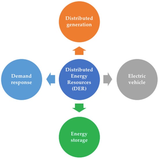 DER are manageable energy resources connected in distribution networks or facilities close to the end user []. DER includes not only generation technologies but also storage systems and controllable loads such as electric vehicles and demand response. Figure 2 shows the classification of DERs.