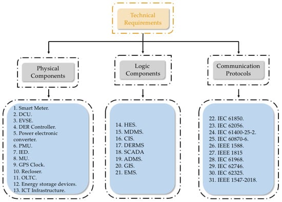 This section presents the technical requirements for DSO design identified in the standards and Smart Grid models studied, based on a system-level approach (Figure 4) through the hardware (logical components), software (logical components), and communication protocols that make possible the interface between the physical and logical parts.