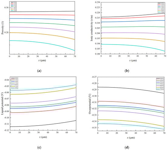 Building upon the uniform porosity structure of the negative electrode, we explore the pore clogging resulting from the growth of the SEI film. Additionally, a detailed analysis is presented regarding the interaction between porosity and key parameters within the LIB. It can be seen form Equation (1) that is related to . The greater , the greater , and the faster the pore clogging occurs. Figure 4 shows the porosity distribution of the negative electrode after 1100 cycles. The x-axis denotes the length of the negative electrode, with the left side corresponding to the position near the current collector and the right side representing the position near the separator. The y-axis represents porosity. We observe a gradual decrease in porosity along the x-direction. As the number of cycles increases, the negative electrode porosity gradient also gradually intensifies. Specifically, numerous side reactions occur near the separator position, resulting in more severe pore clogging. This phenomenon has been confirmed in the study of Muller et al. [18]. This is evident in Equation (6), which indicates that the quantity of side reaction products is related to .