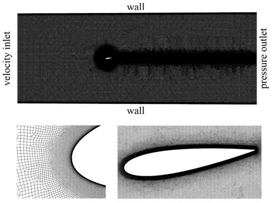 The solver used was pressure-based and transient, with air as the working fluid. Air was modeled with a constant density of ρ = 1.225 kg/m3 and a constant viscosity of μ = 1.7895 × 10−5 kg/(ms). The boundary conditions were specified as follows: a velocity inlet at the left vertical edge of the domain, a pressure outlet at the right edge of the tunnel, and no-slip walls along both the tunnel walls and airfoil surface [30].