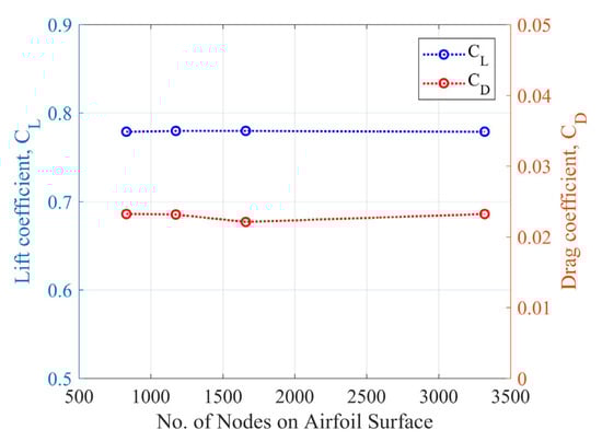 The lift and drag coefficients as functions of the number of nodes on the airfoil surface are shown in Figure 3. The results clearly indicate that the lift coefficient is independent of the grid resolution, while the drag coefficient exhibits minimal sensitivity to the number of nodes. In other words, increasing the number of nodes beyond the nominal mesh resolution does not enhance the accuracy of the computed aerodynamic loads but merely increases the computational cost.