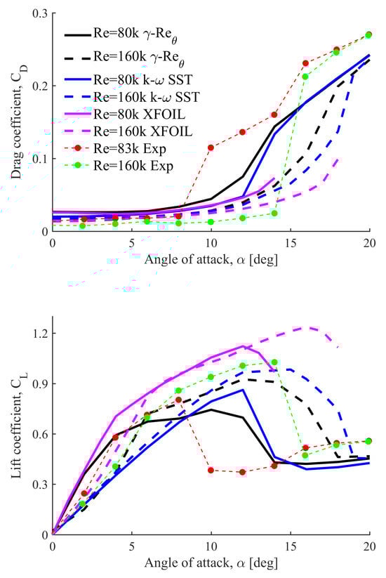 The figure highlights the strong sensitivity of the aerodynamic forces to the Reynolds number. Notably, the experimental lift coefficient CL exhibits nonlinear behavior below the critical angle of attack. As proposed by Rogowski et al. [28], this nonlinearity arises from the presence and evolution of the laminar separation bubbles. These bubbles increase the lift at low angles of attack but also significantly increase the drag. A decrease in the Reynolds number by half reduces CLmax from 1.027 at α = 13.99° to 0.803 at α = 7.95°. Interestingly, at α = 3.96°, the lift coefficient is higher at the lower Reynolds number, with values of 0.406 for Re = 160k and 0.578 for Re = 80k.