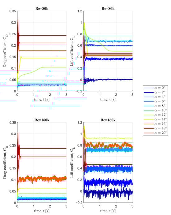 As discussed in the Introduction, the magnitude and frequency of these unsteady phenomena depend on the Reynolds number and the angle of attack. In practice, the magnitude of these unsteady effects manifests as oscillations in the aerodynamic forces, both in terms of their amplitude and frequency. As shown in Figure 5, the largest oscillations in the lift coefficient (CL) are observed at a Reynolds number of 160k, particularly at angles of attack up to 8°. These oscillations decrease around the stall angle but begin to grow again at higher angles of attack. A similar behavior is observed for the drag coefficient (CD), although its oscillation amplitudes are significantly smaller. In contrast, for a Reynolds number of 80k, the oscillations in the aerodynamic forces are much smaller. The aerodynamic characteristics CL and CD shown in Figure 4 represent the time-averaged values of CL (time) and CD (time) (Figure 5) over the last second of the simulation.