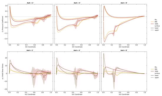 Comparison of pressure coefficient (Cp) and wall shear stress (τx) distributions along the airfoil chord (x/c)) at different angles of attack (2°, 4°, and 8°) for Reynolds numbers of 80k and 160k. The top row presents the Cp distributions, while the bottom row shows σx. The solid lines correspond to the lower surface and the dashed lines to the upper surface.
