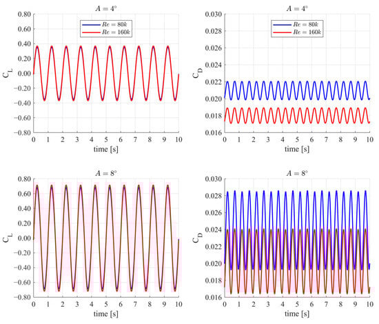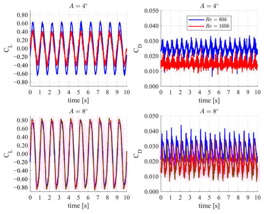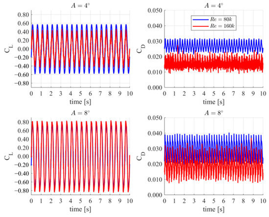 An increase in the amplitude to 8° resulted in a slight increase in the difference between the amplitudes. Despite minor differences in lift force estimation, drag is much more dependent on the Reynolds number, as shown in the right-hand column of the plots in Figure 10.