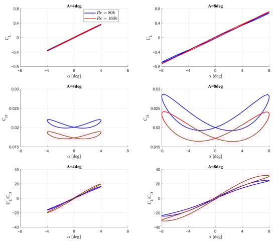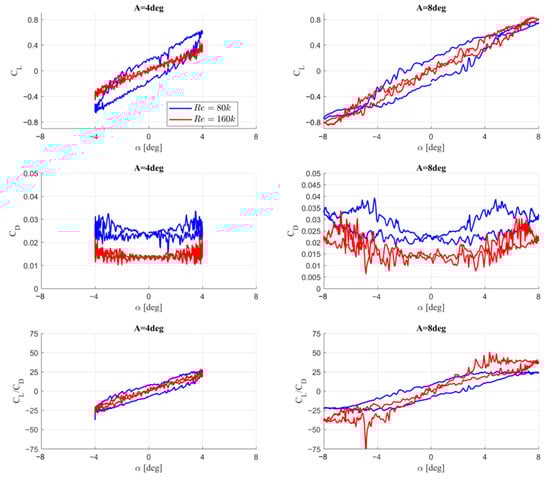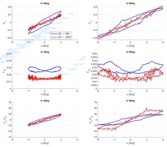 Hysteresis loops of the lift coefficient (CL), drag coefficient (CD), and lift-to-drag ratio (CL/CD) as a function of the angle of attack (α) for pitching amplitudes A = 4° and A = 8° at Reynolds numbers Re = 80k and Re = 160k—13.3 Hz frequency motion. The left column corresponds to A = 4°, and the right column corresponds to A = 8°.