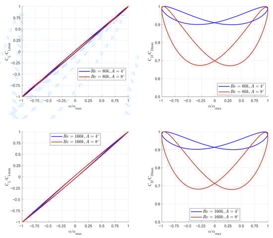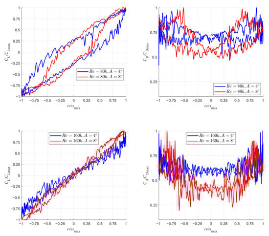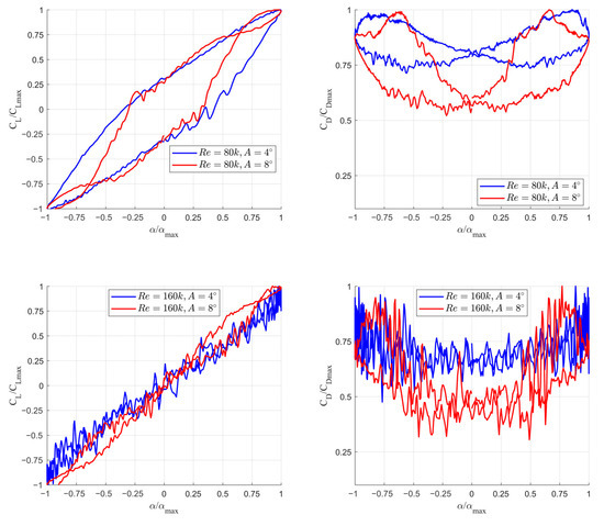Figure 9 illustrates the influence of the amplitude on the hysteresis loops at a given Reynolds number. To compare the aerodynamic force coefficients for different amplitudes, the values of the coefficients were normalized by their respective maximum values. A similar normalization was applied to the angle of attack.