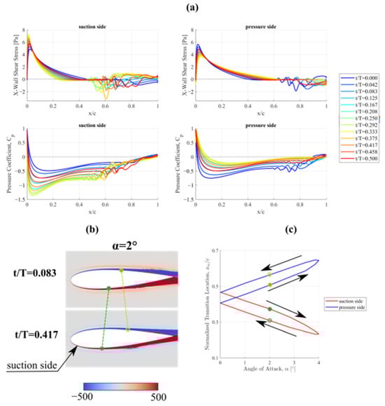 In the Cp plots, the separation is reflected by a stagnation region (the flat part of the curve). Figure 16c depicts the “migration” of the transition location, xtr/c, normalized by airfoil chord c. Different colors represent the transition characteristics of the suction and pressure sides of the airfoil.