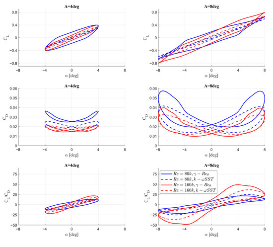 The results presented in this section partially resolve the puzzle of the significant similarities in loads obtained using both approaches-γ-Reθ and k-ω SST. Figure 17 and Figure 18 illustrate the hysteresis loops of the aerodynamic coefficients at the two examined Reynolds numbers and two amplitudes. Both figures compare the results of the two turbulence models, with the dashed lines representing the k-ω SST approach. As can be seen, the k-ω SST model results improved with increasing the Reynolds number. Interestingly, the hysteresis of the CL coefficient obtained using this model is broader for Re = 160k and A = 8°, whereas the agreement between the two approaches for A = 4° is very high. Additionally, the drag coefficients for both amplitudes at high Reynolds numbers are surprisingly consistent.
