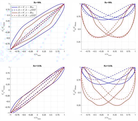 Normalized lift coefficient (CL/CLmax) and drag coefficient (CD/CDmax) as a function of normalized angle of attack (α/αmax) for Reynolds numbers Re = 80k and Re = 160k and pitching amplitudes A = 4° and A = 8°—γ-Reθ model used with 1 Hz frequency motion. The top row compares Re = 80k, while the bottom row compares Re = 160k.