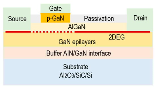 Owing to low technological maturity and high cost of native GaN substrates, the majority of current commercial GaN devices are lateral and are epitaxially deposited on a wafer of Al2O3 (sapphire), SiC, or Si []. The basic lateral structure incorporates a layer of AlGaN on top of the GaN, creating a heterojunction between these two layers. The positive net charge at the AlGaN/GaN junction due to the polarization effect attracts free electrons from the material to achieve charge neutrality. The accumulation of a large number of free electrons in the junction forms a high mobility, high density electron channel, known as a two-dimensional electron gas (2DEG) [,,]. The device is specified as a high electron mobility transistor (HEMT). Due to the native 2DEG channel, it is a depletion-mode normally on HEMT with a negative threshold voltage. To attain normally off operation, preferred for security in power applications, two commercially developed techniques of enhancement mode (e-mode) and hybrid transistors are widely exploited [].