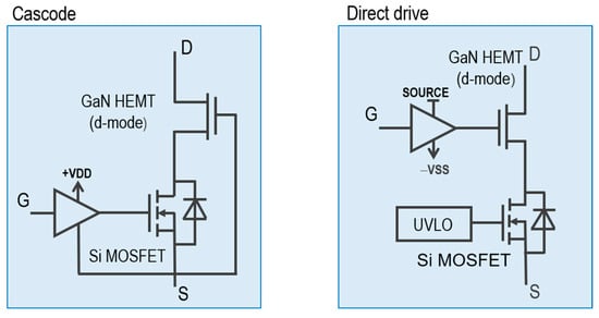 In the direct drive configuration, both transistors are connected in series. Here, the d-mode GaN HEMT is controlled directly from the gate driver. Since the Si MOSFET is always on, its body diode does not turn on due to low RDS(on). As a result, there are no Qrr-related power losses in the direct-drive configuration. Moreover, during normal operation, fast switching capabilities of the d-mode GaN HEMT can be fully exploited, including slew rate control by using the gate current. In the case of a power supply fault, when the driver cannot turn off the GaN HEMT, the under-voltage lockout (UVLO) protection turns off the Si MOSFET to anticipate a short circuit in the converter []. The parameters of the selected commercially available hybrid transistors are enclosed in Table 3.