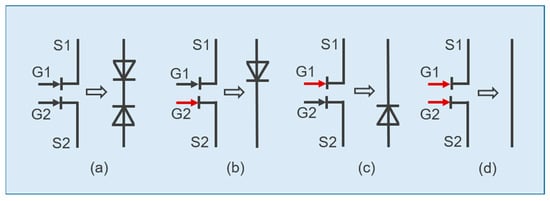Operation modes of the dual gate bidirectional GaN HEMT switch (black—gate is off, red—gate is on); (a) voltage VS1S2 is blocked in both directions, (b,c) voltage VS1S2 is blocked in one direction and the current flows in one direction, (d) bidirectional current conduction.